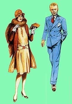 На мужчине обычный для того времени послеобеденный пиджачный костюм с двубортным пиджаком в "матросском" стиле. Характерными его чертами были четкая линия талии и три наружных кармана - два на уровне бедер и один на груди, и украшавшие манжеты три пуговицы. Прямые брюки всегда завершались отворотами. Эти костюмы шились из высококачественных шерстяных тканей, твида, фланели. В то время полагалось всегда иметь носовой платок в нагрудном кармане; в моде были двухцветные туфли ("корреспонденты").